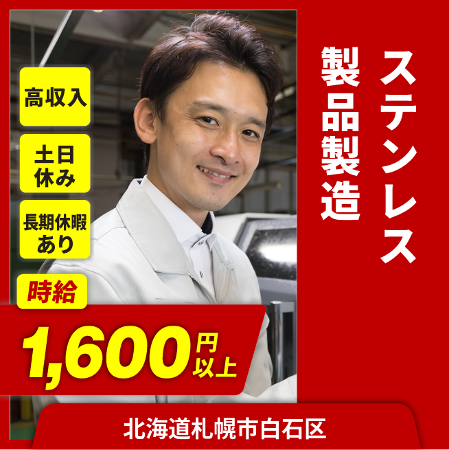 29.2~31.5万円 交通費 支給あり 応募の流れ 本ページ内<応募する>ボタンより、必要項目をご入力の上、ご応募ください。 勤務地 【勤務地】北海道札幌市白石区- 勤務時間 【勤務地】日勤※残業選択可能