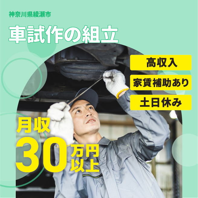 給与詳細 月収例 275,000円 時給例 1,718円 勤務地 神奈川県綾瀬市 仕事内容 ウィルオブ・ワークの正社員として取引先の自動車製造工場で勤務いただきます。