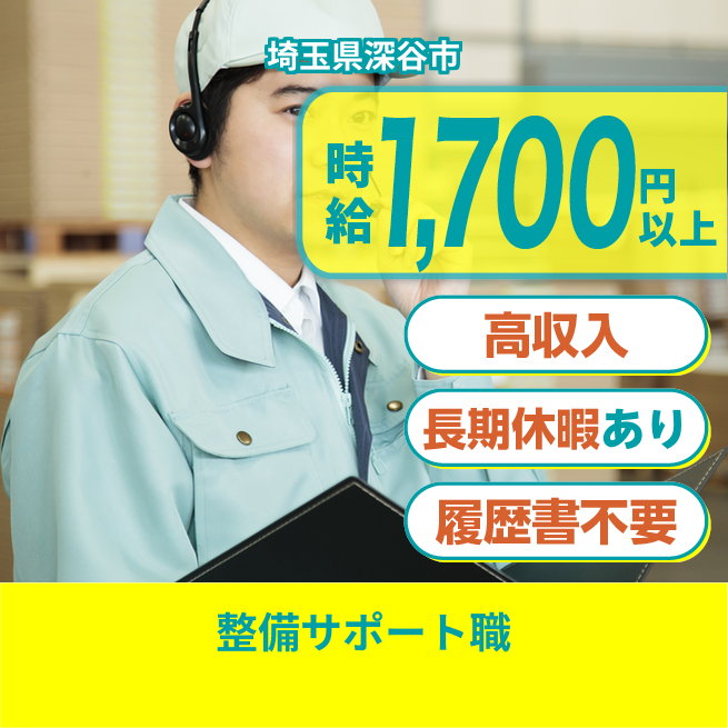 28~34.5万円 交通費 支給あり 応募の流れ 本ページ内<応募する>ボタンより、必要項目をご入力の上、ご応募ください。 勤務地 【勤務地】埼玉県深谷市- 勤務時間 【勤務地】日勤
