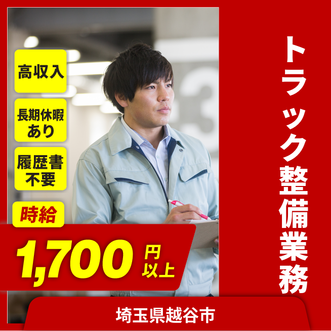 給与詳細 月収例 280,000円 時給例 1,750円 勤務地 埼玉県越谷市 仕事内容 【業務内容】 大手トラックメーカーのカスタマーセンターでのメンテナンス業務