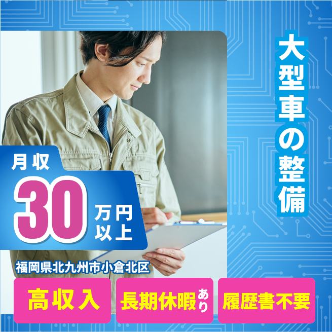 給与詳細 月収例 300,000円 時給例 1,875円 勤務地 福岡県北九州市小倉北区 仕事内容 ウィルオブ・ワークの正社員として取引先の車両整備工場で勤務いただきます。