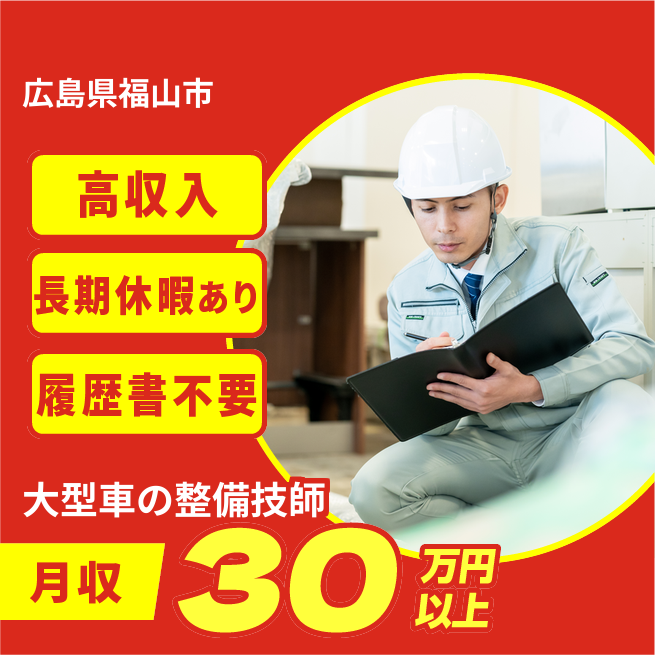給与詳細 月収例 300,000円 時給例 1,875円 勤務地 広島県福山市 仕事内容 ウィルオブ・ワークの正社員として取引先の車両整備工場で勤務いただきます。