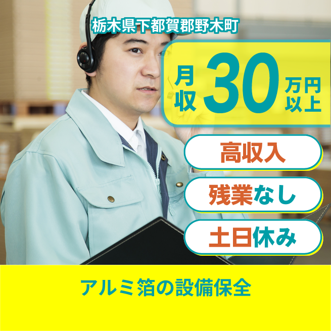 給与詳細 月収例 300,000円 時給例 1,875円 勤務地 栃木県下都賀郡野木町 仕事内容 ウィルオブ・ワークの正社員として取引先のアルミ箔製造メーカーの工場で勤務いただきます。