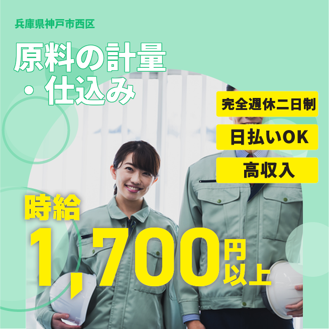 給与詳細 月収例 270,000円 時給例 1,600円 勤務地 兵庫県神戸市西区 仕事内容 原料の計量・仕込み、反応・混合、製品充填等、生産業務全般