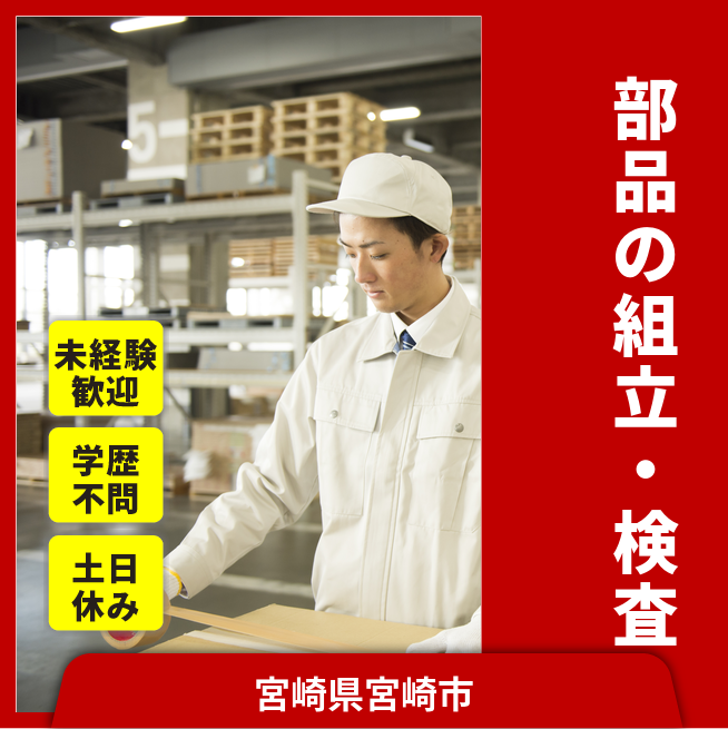 給与詳細 月収例 197,600円 時給例 1,062円 勤務地 宮崎県宮崎市 仕事内容 組立課_一日に1kg程度の部品を数百個程度、個別に組立業務を行ったり、外観検査業務などに従事。