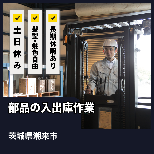 就業場所:無/就業範囲:無 海外から入荷してきた部品をフォークリフトを使用して受け取り、倉庫に入れる作業です。