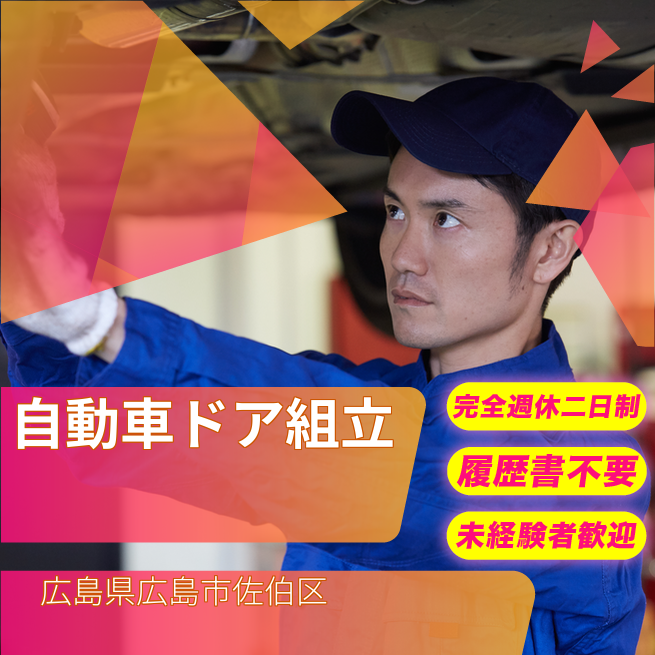 給与詳細 月収例 300,000円 日給例 15,000円 勤務地 広島県広島市佐伯区 仕事内容 【業務内容】自動車用ドアの組立作業
