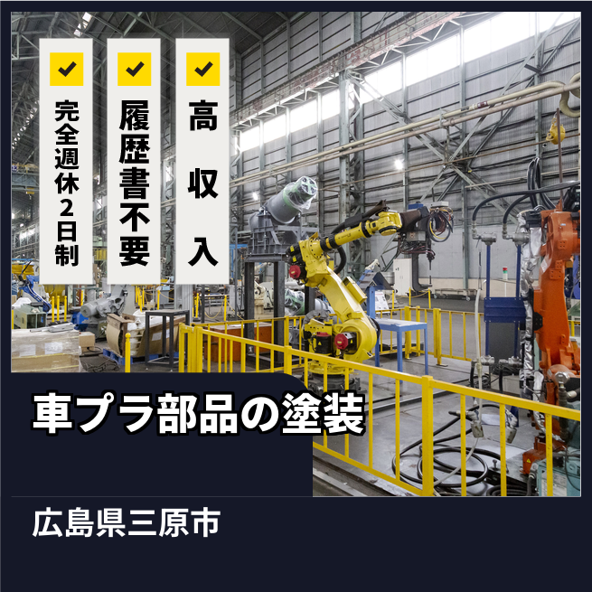 給与詳細 月収例 320,000円 日給例 16,000円 勤務地 広島県三原市 仕事内容 プラスチック部品の塗装、塗装後の検査、塗装後の製品の組立