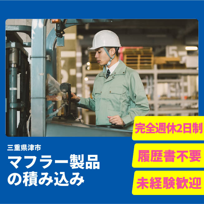 給与詳細 月収例 306,150円 日給例 12,560円 勤務地 三重県津市 仕事内容 【業務内容】自動車用排気系製品の積み込み作業