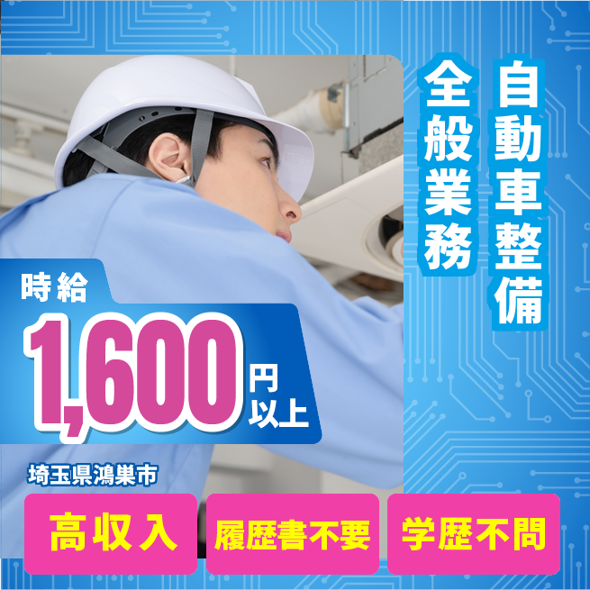 =260,800円 応募の流れ 本ページ内<応募する>ボタンより、必要項目をご入力の上、ご応募ください。 勤務地 【勤務地】埼玉県鴻巣市新宿 勤務時間 【勤務地】9:00~18:00 休憩60分 必須資格 2級自動車整備免許必須、経験者のみ 福利厚生 交通費
