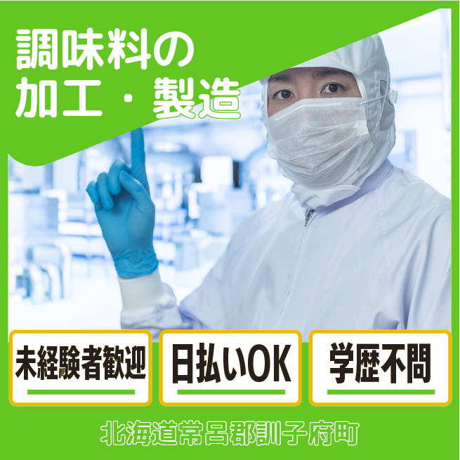 給与詳細 月収例 241,400円 日給例 10,880円 勤務地 北海道常呂郡訓子府町 仕事内容 【調味料の加工・製造スタッフ】