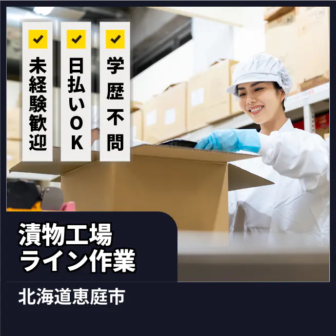 給与詳細 月収例 209,870円 時給例 1,090円 勤務地 北海道恵庭市 仕事内容 【業務内容】