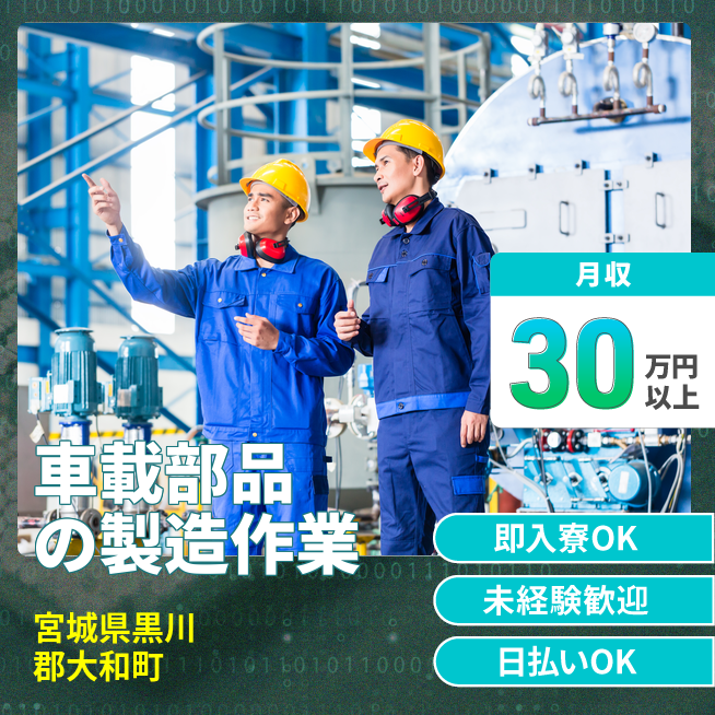 給与詳細 月収例 281,617円 日給例 11,200円 勤務地 宮城県黒川郡大和町 仕事内容 【車載部品の製造作業】