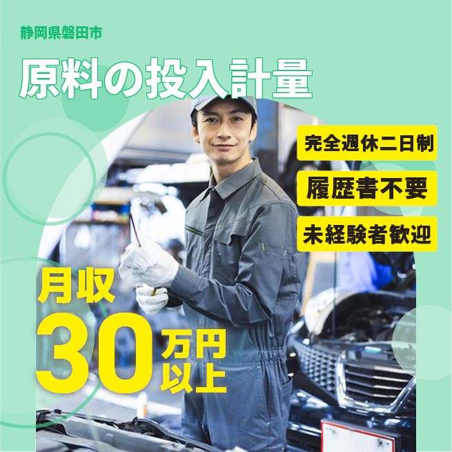 給与詳細 月収例 285,000円 時給例 1,900円 勤務地 静岡県磐田市 仕事内容 材料投入、計量、液体を吸い上げる機械のセット、データ確認、運搬。