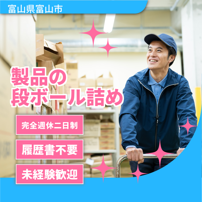 給与詳細 月収例 238,000円 日給例 11,900円 勤務地 富山県富山市 仕事内容 【業務内容】製品の梱包および包装作業