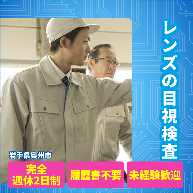 給与詳細 月収例 177,000円 時給例 1,300円 勤務地 岩手県奥州市 仕事内容 プラスチックレンズの目視検査及び付帯作業(クリーンルーム環境)