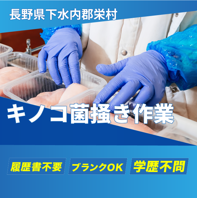 給与詳細 月収例 192,000円 時給例 1,200円 勤務地 長野県下水内郡栄村 仕事内容 【業務内容】ぶなしめじを製造する工場でのキノコの菌掻き作業