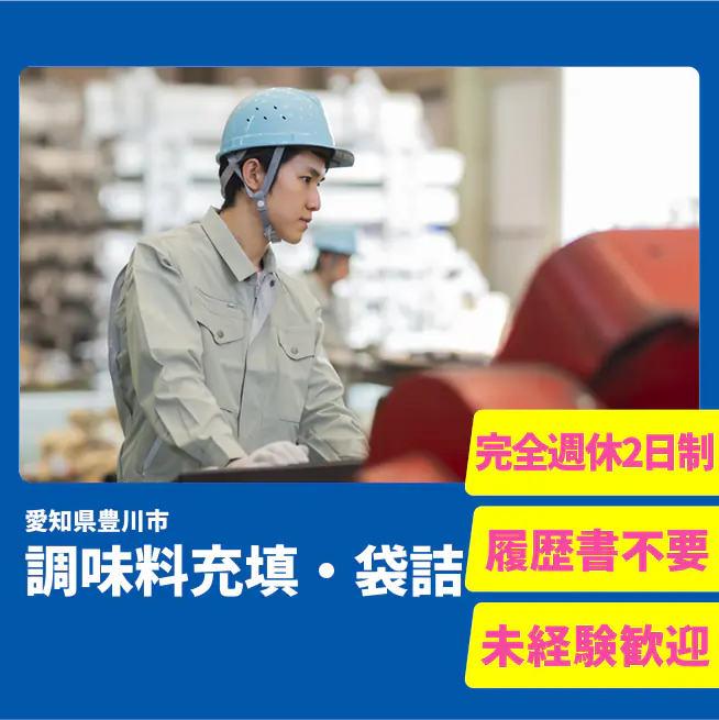 給与詳細 月収例 200,000円 日給例 10,000円 勤務地 愛知県豊川市 仕事内容 【業務内容】調味料のボトルや袋の詰め作業