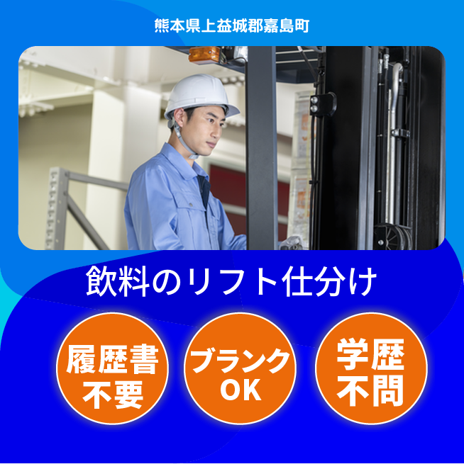 給与詳細 月収例 234,000円 時給例 1,200円 勤務地 熊本県上益城郡嘉島町 仕事内容 倉庫内でフォークリフトを使用した飲料の仕分け・荷下ろし・積み込み業務。