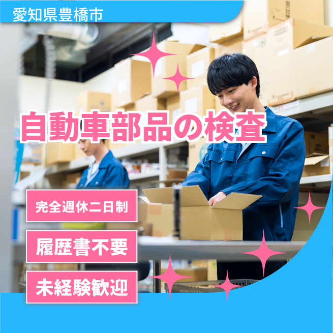 給与詳細 月収例 243,750円 日給例 10,000円 勤務地 愛知県豊橋市 仕事内容 【業務内容】自動車部品の検査と出荷準備