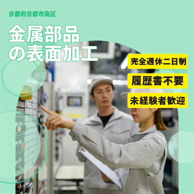 給与詳細 月収例 243,750円 日給例 10,000円 勤務地 京都府京都市南区 仕事内容 【業務内容】金属製品の表面加工業務