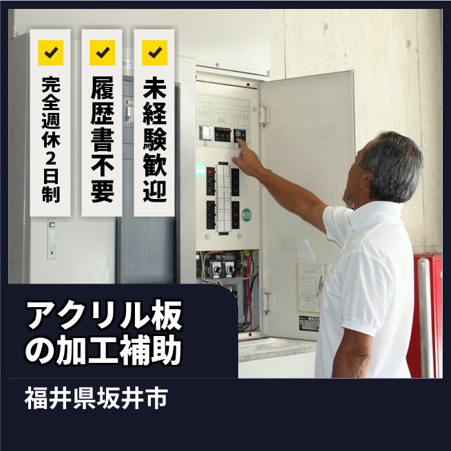 給与詳細 月収例 255,000円 日給例 12,750円 勤務地 福井県坂井市 仕事内容 クリーンルーム内にて1ミリ程度のアクリル版を機械から取り出し、製品の上段にシールを貼る。その後専用のジグに機械を挟み撥水機に投入