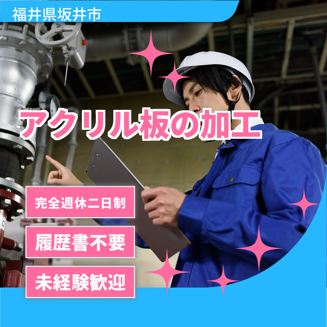 給与詳細 月収例 255,000円 日給例 12,750円 勤務地 福井県坂井市 仕事内容 【業務内容】クリーンルームでのアクリル板の加工と撥水処理