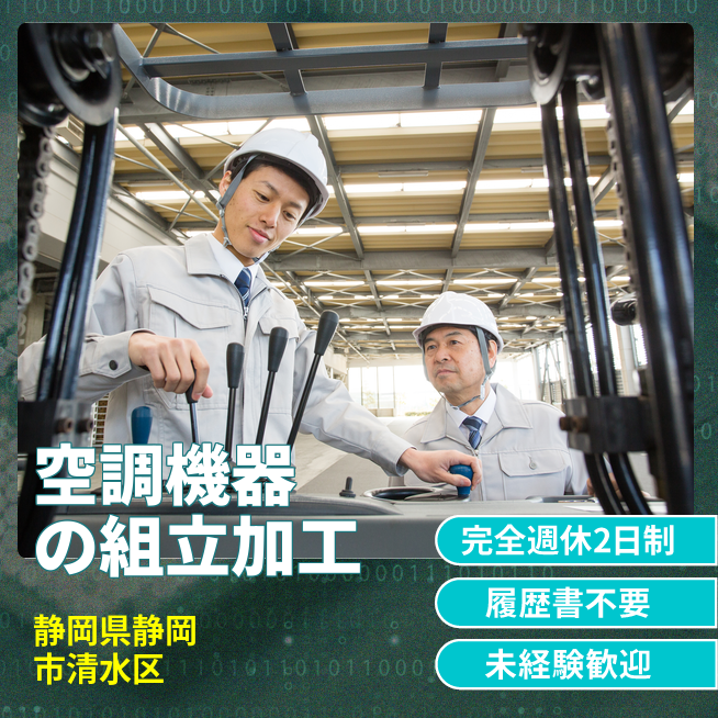 給与詳細 月収例 240,000円 日給例 12,000円 勤務地 静岡県静岡市清水区 仕事内容 業務用エアコンや空調機器を製造するお仕事です。主に組立・加工・検査の作業を担当します。組立作業では、マニュアルを見ながら電動ドライバーを使って部品を取り付けていきます。手順がしっかり決まっているので、初めての方でも安心して作業できます。加工では、金属製品を加工機にセットし、機械を操作します。研磨は機械が自動で行うため、加工が終わったら製品を取り出し、次の製品をセットする作業を繰り返します。場合によっては、同じタイプの加工機を複数台担当することもあります。検査作業では、組立後の製品がきちんと動くかを電通測定器で確認します。また、加工後の製品についても、マニュアルに沿ってキズなどがないか目でチェックします。その他、配管や配線、組付けなどの作業も行います。