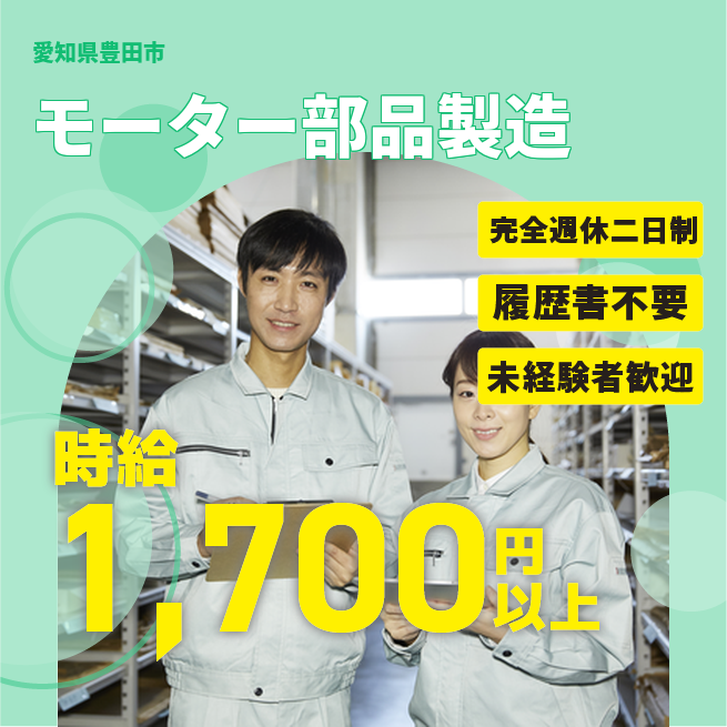 給与詳細 月収例 325,800円 時給例 1,700円 勤務地 愛知県豊田市 仕事内容 自動車要パワーシートの手のひらサイズのモーターの製造部署です。