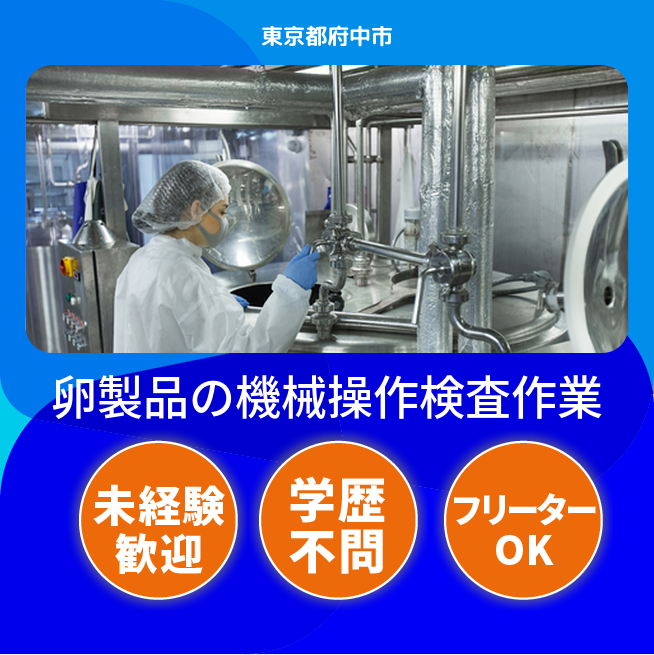 給与詳細 月収例 224,000円 日給例 11,200円 勤務地 東京都府中市 仕事内容 コンビニ向けの卵製品を加工している食品工場です。お弁当の上に乗ってる半熟卵、厚焼き玉子、サンドイッチ用の卵などの加工機械オペレーター作業になります。生卵を機械にセットし、加工されたら目視検査をして、出来上がった製品の詰める作業を行います。その他にも、材料の運搬や機械の洗浄作業や工場内の清掃作業などもあります。
