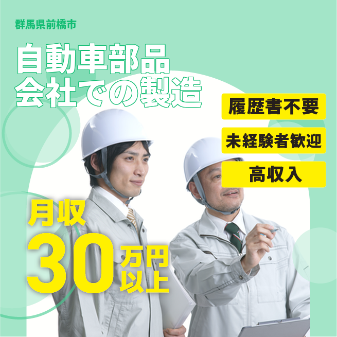 給与詳細 月収例 300,000円 日給例 11,200円 勤務地 群馬県前橋市 仕事内容 ★自動車部品製造会社で製造(組立、検査、加工)