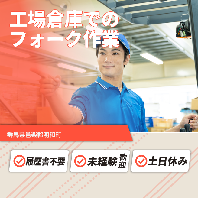 給与詳細 月収例 227,500円 日給例 10,400円 勤務地 群馬県邑楽郡明和町 仕事内容 ★工場倉庫内でフォークリフト(商品移動、荷積み、入力作業)