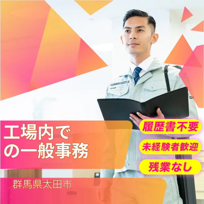 月給例:170500円 交通費 支給あり 応募の流れ 本ページ内<応募する>ボタンより、必要項目をご入力の上、ご応募ください。 勤務地 【勤務地】群馬県太田市東新町 勤務時間 【勤務地】【勤務時間】8:30~17:15 実働7時間45分