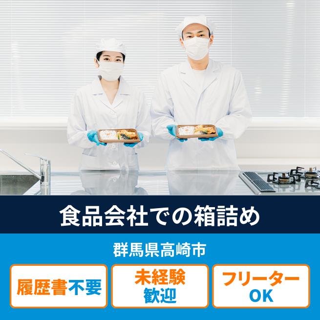 給与詳細 月収例 208,000円 時給例 1,070円 勤務地 群馬県高崎市 仕事内容 ★食品会社で箱詰め作業(パック詰め、検品、出荷準備)