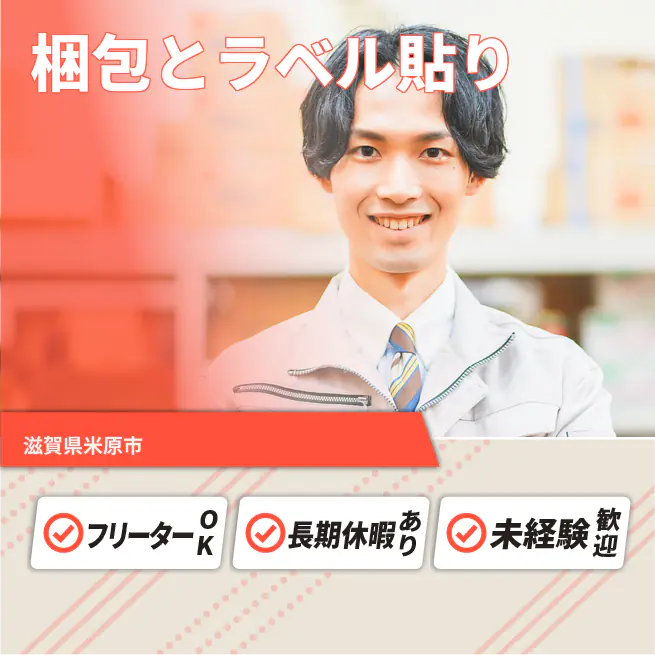 【重い物なしの梱包・ラベル貼り】 『時給1350円軽作業! 土日祝休みでプライベートも充実』 #夕方17時まで #女性活躍中 #時給1350円 #日勤専属 #シールの出荷管理 #データ入力 #車・バイク通勤OK #ガソリン代支給 #残業少なめ (1)重い物&難しい作業なし!未経験OKの出荷管理 (2)日勤のみ・残業月10時間程度で働きやすさ抜群! (3)車・バイク通勤OK!ガソリン代支給あり ▽研修・サポート充実で未経験の方も安心 作業内容や工場ルールなどを入社後の研修で教わります。 研修が終わったあとも先輩スタッフや社員さんが サポートしてくれるので、安心して仕事に取り組めますよ。 【受動喫煙対策】 受動喫煙対策あり(詳細は面接時) 将来の配置転換などによる変更の範囲 就業場所:全国/就業範囲:派遣先業務全般(詳細は就業条件明示書で明示する)