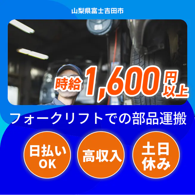 【部品の運搬・ピックアップ作業】 『フォークリフトの資格を活かして高時給1600円!』 #日勤 #10~50代半ば活躍中 #土日休み #残業少なめ #運搬 #ピッキング #倉庫内作業 #リフト #車通勤可 (1)16:30までの日勤で仕事終わりの時間がたくさんあります! (2)資格・経験が活かせる仕事をしたい方にオススメ (3)実際に働く工場の見学ができるので雰囲気など知ることができ安心! ▽10~50代の男性スタッフが活躍中 工場の見学ができるので働く前に職場の雰囲気が確認できます! ▽工場内の設備充実! お昼にはお弁当の注文も可能です。 【受動喫煙対策】 受動喫煙対策あり(詳細は面接時) 将来の配置転換などによる変更の範囲 就業場所:全国/就業範囲:派遣先業務全般(詳細は就業条件明示書で明示する)