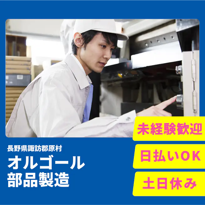 【オルゴールの部品作り】 「未経験から始めやすい金属機械加工」 #日勤 #20~50代活躍中 #土日祝休み #部品のセット・ボタン操作 #冷暖房完備 #長期休暇年3回 #通勤時のガソリン代支給 (1)機械に部品をセットしてボタンをポチッと押すシンプル作業 (2)冷暖房完備の職場で、年間通して快適な環境 (3)お給料日を待たなくてOK!スマホでラクラク日払い申請可 ▽20~50代の男性スタッフが活躍中 モノづくり経験のない方も先輩スタッフや社員さんが しっかりサポートするのでご安心ください。 【受動喫煙対策】 受動喫煙対策あり(詳細は面接時) 将来の配置転換などによる変更の範囲 就業場所:全国/就業範囲:派遣先業務全般(詳細は就業条件明示書で明示する)