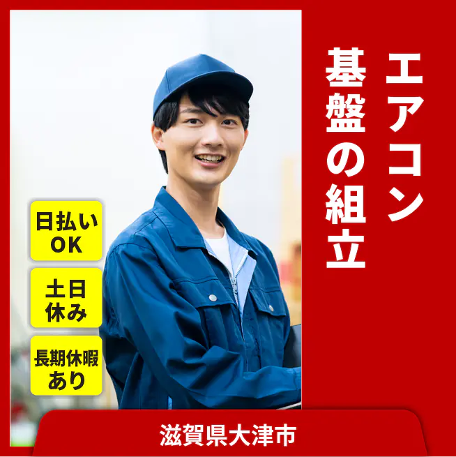 【基盤の組立・加工】 『機械の操作や組立作業で時給1450円!』 #時給1450円 #機械の操作 #組立 #土日祝休み #日払い可 #駅チカ #残業月20時間程度 #機械OP経験者歓迎 (1)経験活かして高収入!月収27.9万円以上可 (2)長期休暇は年3回あり、各4~5連休です (3)入社前の工場見学で、実際の作業風景を見学OK ▽10代~40代のスタッフさん活躍中 大津市内の他、草津市、守山市、野洲市など 近隣エリアから通勤されているスタッフさんもいらっしゃいます。 【受動喫煙対策】 受動喫煙対策あり(詳細は面接時) 将来の配置転換などによる変更の範囲 就業場所:全国/就業範囲:派遣先業務全般(詳細は就業条件明示書で明示する)
