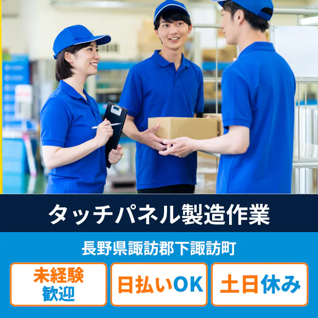 【タッチパネルの組立・梱包】 『下諏訪駅より徒歩5分の好立地!』 #車・バイク通勤もOK #交通費支給 #性別問わず50代活躍中 #専属シフト #土日休み #残業月15時間程度 #時給1150円 (1)未経験から始めやすい!ライン作業なしのモクモク軽作業 (2)専属勤務シフト&土日休みでワークライフバランス安定 (3)下諏訪駅より徒歩5分&車・バイク通勤でも交通費支給 ▽10~50代のスタッフが活躍中 重い物を扱わないお仕事なので女性のスタッフも たくさん活躍されている職場です。 モノづくり経験のない方も先輩スタッフや社員さんが しっかりサポートするのでご安心ください。 【受動喫煙対策】 受動喫煙対策あり(詳細は面接時) 将来の配置転換などによる変更の範囲 就業場所:全国/就業範囲:派遣先業務全般(詳細は就業条件明示書で明示する)