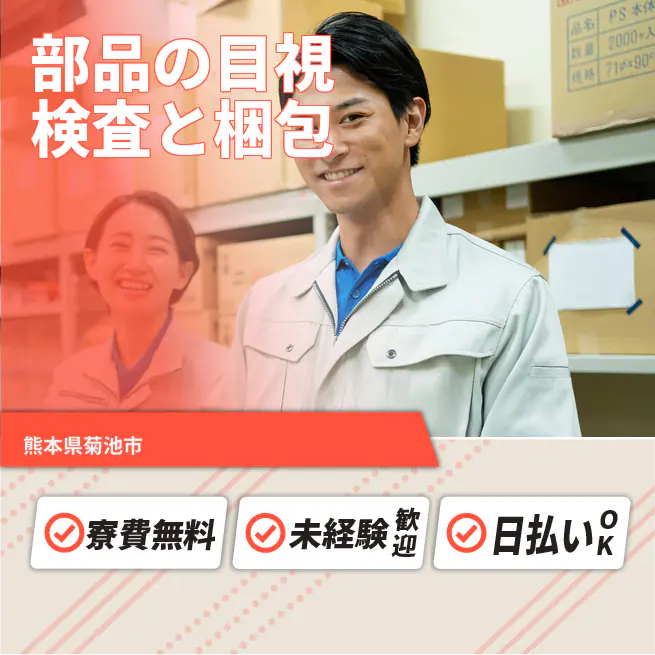 • 【部品の見た目チェックと運搬】 『お仕事中ずっと寮費無料!  寮~車・バイクでラクラク通勤◎』 #家具家電付き1R #20~40代活躍中 #3ヵ月毎にプチボーナスあり #経験不問 #ライン作業なし #赴任交通費支給 (1)家具家電付きワンルームがお仕事中ずっと寮費無料 (2)高収入&3ヶ月ごとに5万円のボーナスを支給! (3)未経験から始めやすい◎チェック→梱包→運搬のシンプル作業 ▽20代~40代のスタッフさん活躍中 モノづくりが初めてでも、先輩スタッフさんや 社員さんがサポートしてくれるので安心です。 ▽クリーンルームでのお仕事です 空気中のゴミやホコリの侵入を防ぐため、 クリーンスーツ(防塵服)を着用します。 室内は温度が一定に管理されているので、 年中改定にお仕事していただけます。 【受動喫煙対策】 受動喫煙対策あり(詳細は面接時) 将来の配置転換などによる変更の範囲 就業場所:全国/就業範囲:派遣先業務全般(詳細は就業条件明示書で明示する)