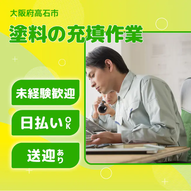 • 【塗料材料の充填・計量】 『未経験から実質時給1460円!皆勤手当も支給』 #羽衣駅~送迎バス運行中 #工場見学実施中 #3交替 #週休2日 #残業月0~5時間程度 #車・バイク通勤OK #ガソリン代支給 (1)羽衣駅~無料送迎バス運行中!車・バイクでラクラク通勤もOK (2)髪型も自由!優しく丁寧な社風でどんどん頼れる職場 (3)工場見学実施中!事前の見学で安心してお仕事スタート 【受動喫煙対策】 受動喫煙対策あり(詳細は面接時) 将来の配置転換などによる変更の範囲 就業場所:全国/就業範囲:派遣先業務全般(詳細は就業条件明示書で明示する)