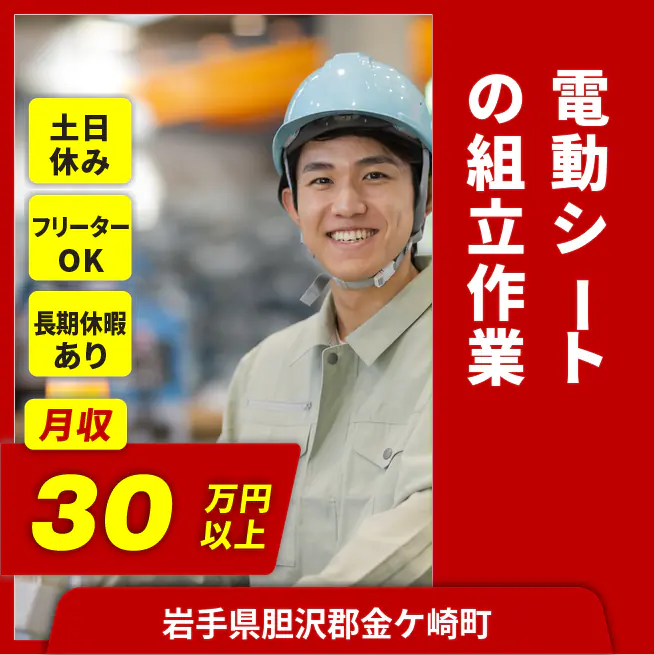 【自動車シートの部品組立・カバー取付け】 『未経験から月収32.8万円以上可能!』 #時給1400円 #2交替シフト #土日休み #大手メーカー工場 #残業月20~40時間程度 #ネジ締めやパチッと取り付け #車通勤OK (1)未経験でも安心の研修・サポートがしっかりした環境 (2)予定の立てやすい土日休み&長期休暇年3回とプライベートも充実 (3)事前の工場見学で安心!大手メーカーの工場を実際に見学OK ▽しっかりした研修で未経験の方も安心 工具の使い方から実際の作業内容などを 入社後の研修で教わります。 研修が終わったあとも現場で先輩スタッフや社員さんが しっかりサポートしてくれるので安心して仕事に取り組めますよ。 【受動喫煙対策】 受動喫煙対策あり(詳細は面接時) 将来の配置転換などによる変更の範囲 就業場所:全国/就業範囲:派遣先業務全般(詳細は就業条件明示書で明示する)