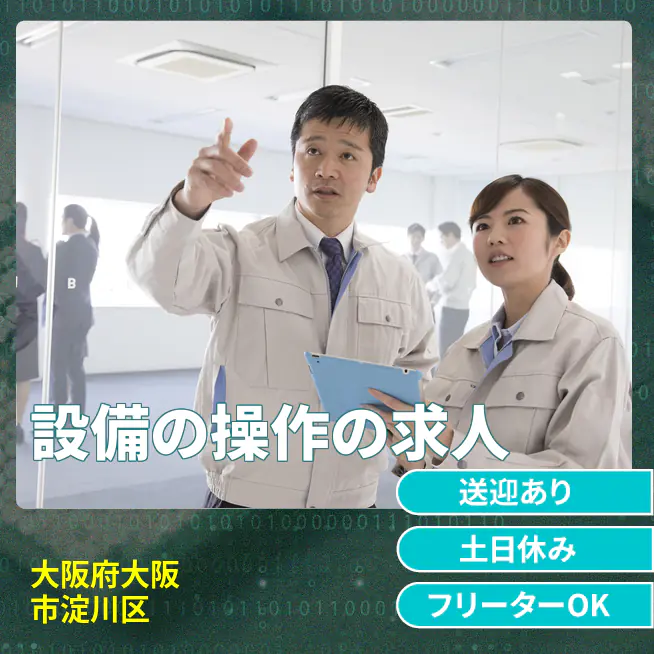 • 【設備の操作・保守管理】 『正社員雇用前提!未経験から始める保守管理』 #経験不問 #20~40代活躍中 #日勤専属 #無料送迎バス運行中 #江坂駅~徒歩15分 #土日休み #残業基本なし #喫煙所完備 (1)未経験の方も安心!まずは派遣社員から経験が積める◎ (2)江坂駅~徒歩15分!東淀川駅、東三国駅~送迎バス運行中 (3)事前の工場見学で安心してお仕事スタート! ▽20~40代の男性スタッフが活躍中 モノづくり経験のない方も先輩スタッフや社員さんが しっかりサポートするのでご安心ください。 【受動喫煙対策】 受動喫煙対策あり(詳細は面接時) 将来の配置転換などによる変更の範囲 就業場所:全国/就業範囲:派遣先業務全般(詳細は就業条件明示書で明示する)
