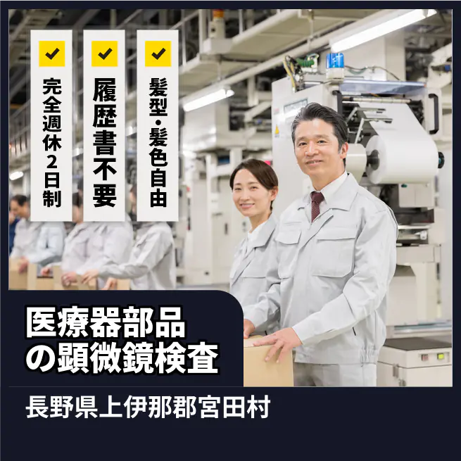 【業務内容】 医療器部品の顕微鏡を使った検査および仕上げ作業 <業務例一覧> - 医療器部品を顕微鏡で拡大し、細かい傷や不良箇所を確認する - 部品の測定を行い、規格に合っているかを確認する - 検査結果を記録し、データを整理する - 検査後の部品を必要に応じて手作業で仕上げる - 作業環境を清潔に保ち、安全に作業を行う ATR5