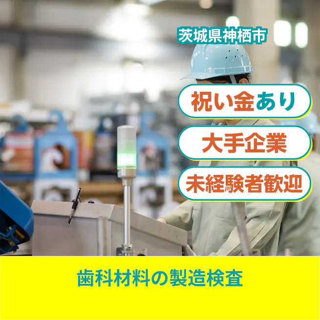 【業務内容】 歯科用詰め物の製造と検査を担当する作業 <業務例一覧> - ペースト状の原料を熱で固めて長方形に成形する作業 - 固めた長方形を正方形のサイコロ状に切断する作業 - 切断後の製品を目視でヒビや割れ、凹凸がないか確認する検査 - 専用の機械を使用して製品の内部をX線で検査する作業 - 金属製のピンを機械で取り付け、ピンの垂直度を確認する作業 - 全作業をローテーションしながら習得する可能性あり ATR3