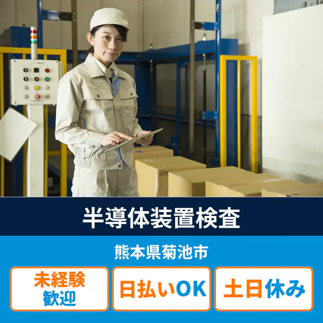 【機械の動作テスト】 『未経験でも実質時給1500円! パソコンでポチポチ動作チェック』 #月収28万円以上可 #20~50代半ば活躍中 #日勤シフト #土日休み #日払いOK #熊本県内の各工場へ出向 #通勤時のガソリン代支給 (1)時給UP中!今ならずっと実質時給1500円でしっかり稼げる! (2)空調完備のクリーンな環境で、座ってパソコンをポチポチするお仕事 (3)日勤&土日休みで生活リズム安定。プライベートも大事にしたい方に◎ 今、最も勢いのある半導体装置の製造に携われます。 未経験からでも、この業界の経験があるだけで 将来のキャリアに大きなプラスになります。 【受動喫煙対策】 受動喫煙対策あり(詳細は面接時) 将来の配置転換などによる変更の範囲 就業場所:全国/就業範囲:派遣先業務全般(詳細は就業条件明示書で明示する)