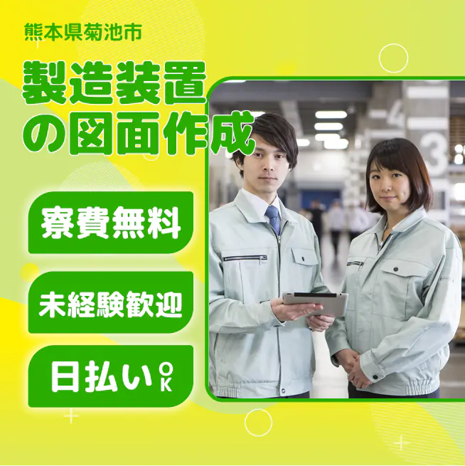 【製造装置の図面作成】 『寮費無料×時給1500円 働きながら手に職を付ける』 #家具家電付き1R #20~50代半ば活躍中 #月収28.1万円以上可 #日勤 #土日祝休み #熊本県内の各工場へ出向 #赴任交通費支給 (1)家具家電付きの1Rで快適生活◎寮費無料 (2)日勤でも月収28.1万円以上可!日払いも利用OK (3)知識はあるけど経験がないという方も大歓迎です! ▼新生活も安心サポート! 現地担当者が入寮後の困りごともすぐ解決! スーパーや病院など周辺情報も丁寧にお伝えし、 快適な生活をサポートします。 【受動喫煙対策】 受動喫煙対策あり(詳細は面接時) 将来の配置転換などによる変更の範囲 就業場所:全国/就業範囲:派遣先業務全般(詳細は就業条件明示書で明示する)