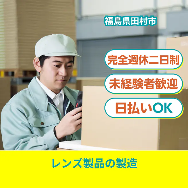 【業務内容】レンズ製品の製造工程における作業 <業務例一覧> - ガラスを機械にセットし、ボタンを押して加工を開始 - 完成した製品の表面にキズや汚れがないかを目視やルーペで検査 - 検査を終えた製品を専用の箱に詰めたり、袋詰めをする - 簡単な機械操作や製品の検品作業を行う - 作業環境の清掃や整理整頓を行い、快適な作業環境を維持する ATR3