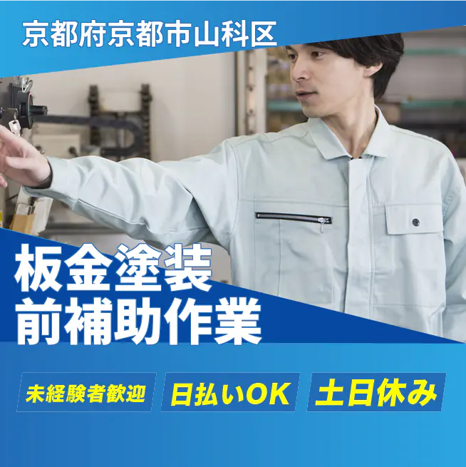 【板金加工・塗装前の補助作業】 『残業は希望の方のみ◎経験不問&重作業なし』 #日勤 #20~40代活躍中 #土日祝休み #冷暖房完備 #バリ取り #テープ貼り #椥辻駅~徒歩圏内 #車・バイク通勤OK (1)日勤&土日祝休みで生活バランス安定 (2)スマホで簡単!日払い利用OK (3)事前の工場見学で安心してお仕事スタート! ▼“初めて”が強みに 使う道具や手順もきちんと決まっており、 専門知識や経験がないからこそ スムーズに覚えられた!という方も。 もちろん、経験を積んでスキルアップも目指せます。 【受動喫煙対策】 受動喫煙対策あり(詳細は面接時) 将来の配置転換などによる変更の範囲 就業場所:全国/就業範囲:派遣先業務全般(詳細は就業条件明示書で明示する)