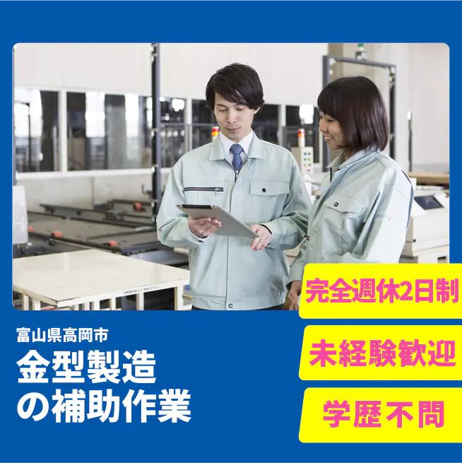 【業務内容】 アルミ製品の押出し加工における金型製造と補助作業 <業務例一覧> - 玉掛けを使用して部材を安全に移動させる作業 - クレーンを操作して部材を適切な位置に配置する - 押出し加工機の操作サポート - 製造ラインの補助業務を行い、効率的な生産をサポート - 金型のセットアップやメンテナンスの補助 - 安全基準に従った作業環境の維持 - 必要な道具や機器の準備と確認 ATR3